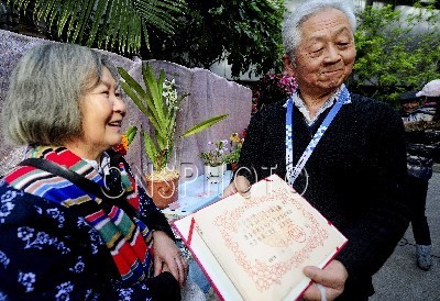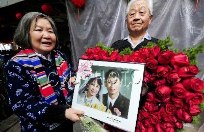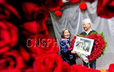 2月14日,76岁的援藏老人马高强与携手52载的老伴73岁的杜英杰老人在北京植物园心形玫瑰花束前,手捧当年的结婚照,再次留下幸福的身影,并展示当年的结婚证书。当日,100位金婚夫妇来到北京植物园参加这里举办的“金婚夫妇”专场活动。今年参加活动的金婚夫妇婚龄最长的已达60年。在活动现场,每对金婚夫妇都得到了一支象征烂漫爱情的玫瑰花,大家在现场表演了自己的才艺,讲述金婚的风雨历程。
